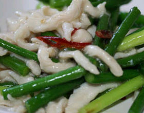 6.放入蒜苔加热翠绿色时,滗去余油;锅中留少许油,将味汁调匀倒入锅中,待收汁亮油后,起锅装盘即成。
