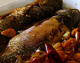 3.原锅留油少许坐火上,下肉末,葱花,姜末,泡椒末炒出香味,加豆瓣酱,煸炒出红油,再放进酒酿炒散,然后加绍酒,白糖,用小火焖烧五六分钟左右,至鲫鱼熟透,加味精,葱花,用旺火收紧卤汁,下湿淀粉勾芡,浇上烧热的熟猪油,起锅前淋少许醋和麻油即成。