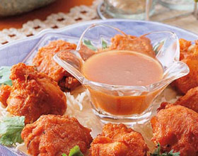 炸虾酱鸡块:'1.虾酱等调料调匀成汁,将生鸡块放入腌渍2小时以上;2.锅中加物油烧热,将鸡块放入炸熟,至金黄色。...