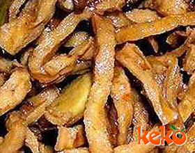 炒豆腐松:'1.老豆腐放入开水锅内,加少许精盐,盖上盖,烧至起空洞,用漏勺捞起,放入盆里,将豆腐划两刀使其沥去水分。酱瓜,酱姜切成细末。2.将锅烧热放入熟花...