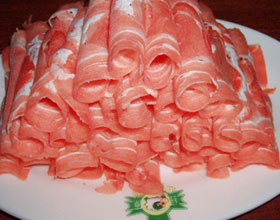 涮羊肉:'1.肉选净肉,放在-5℃的冷库中冷藏12 小时,待肉冻僵后,再行切片,切时将冰冻肉去掉边缘和肉头,片去云皮(即附在肉上的一层薄膜)、脆骨和未剔净的...