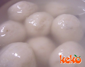 3.锅内放清水,烧沸后将汤团生坯放下去,并用铁勺背部不时在锅底搅动,以免汤团相互粘住或粘在锅底。约煮10分钟,水沸,汤团浮起呈玉色时,再加些冷水在锅里不使水沸滚,并让汤团在锅中焖3至4分钟,出锅即成。